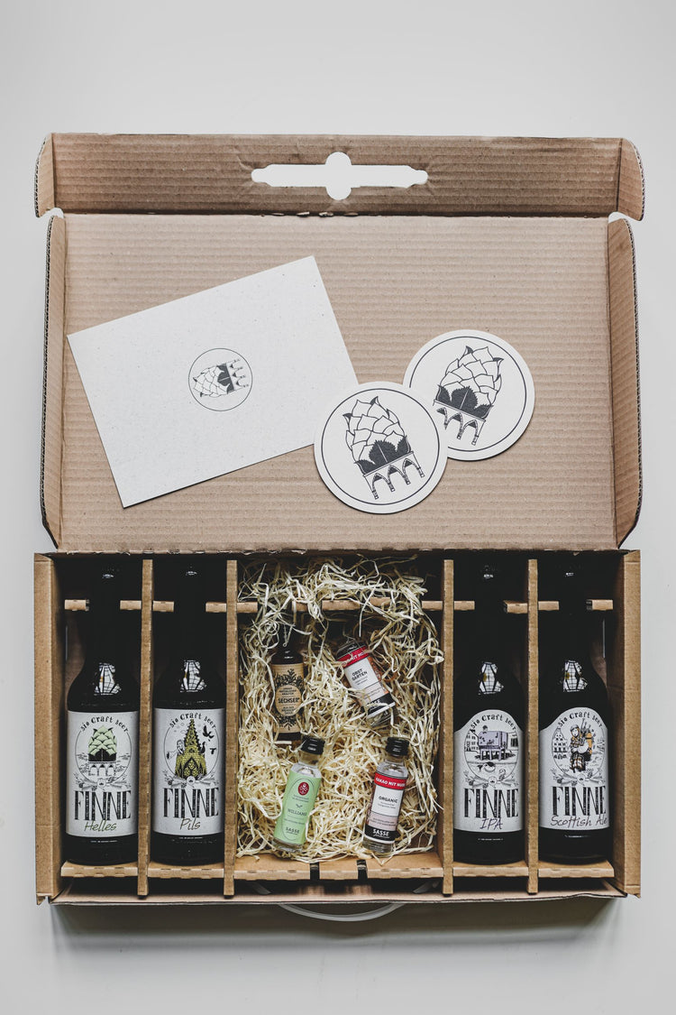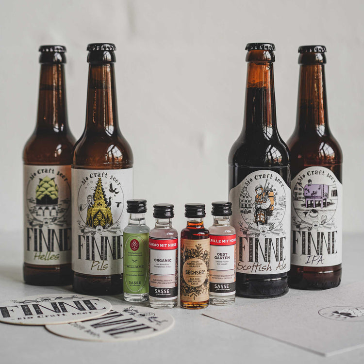Spannender Genuss im Geschenkset mit vier verschiedenen Finne Bieren und dazu passend abgestimmte Spirituosen von unserem Münsterländer Partner Sasse.