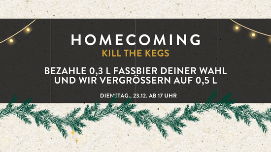 Bevor die Familienfeiern starten und der Festtagswahnsinn losgeht, laden wir Euch zu einem entspannten Homecoming-Abend in unserer Viertelbrauerei ein.SUPERSONDERFEIERTAGSANGEBOT: